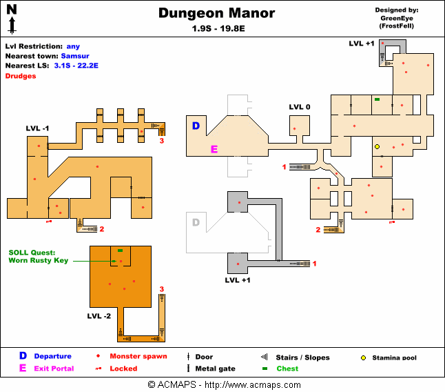 - From Samsur, enter the Dungeon Manor at 1.9S, 19.8E.
